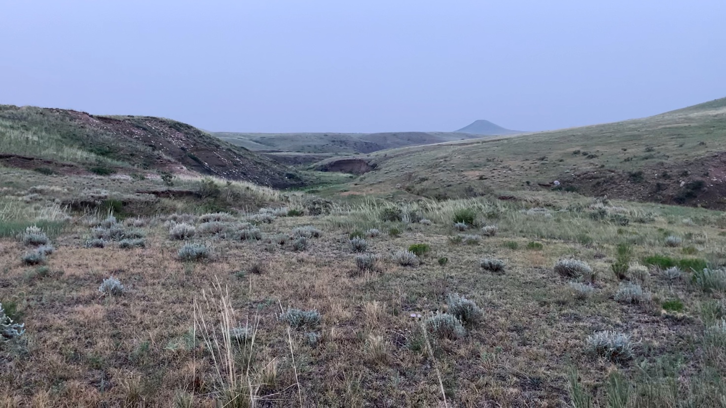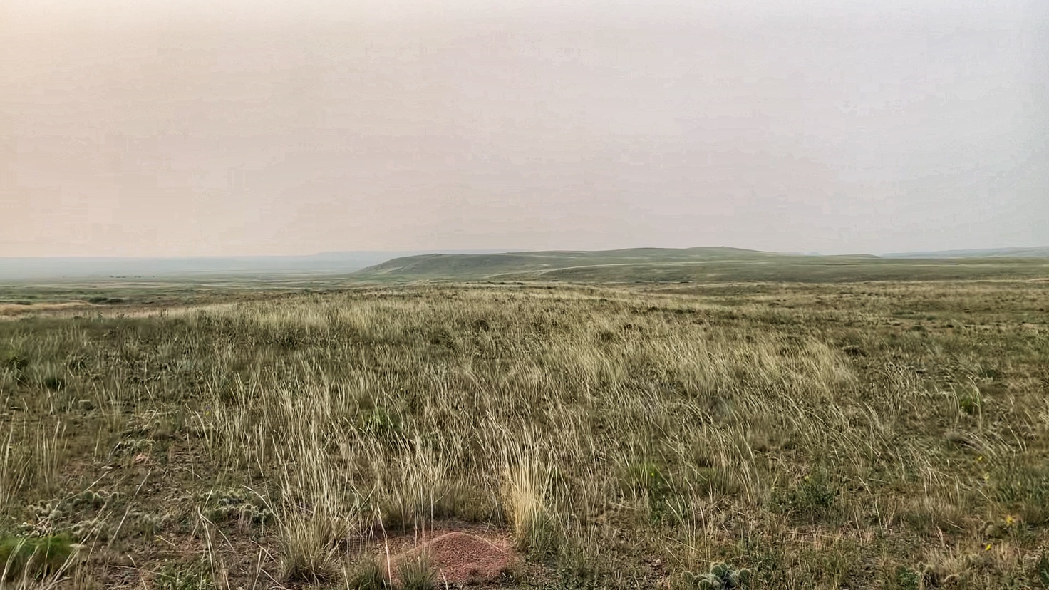 But I decided to make the try. I got a hotel in Windsor, about 45 minutes south of the prairie. I woke up at 4:30 and took off in the dark. It was just first light when I pulled into the parking lot. There’s tons of smoke in the air from fires in California, and that cast an odd color and fuzziness on the prairie. I was disappointed to discover that the wind was blowing hard — at times I’m sure it reached 20 mph or more.