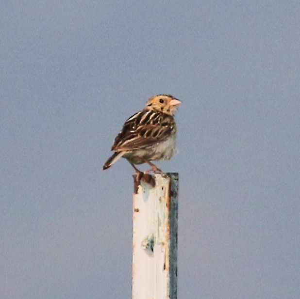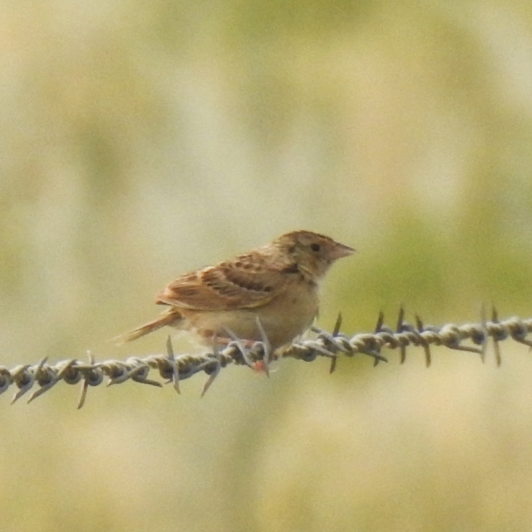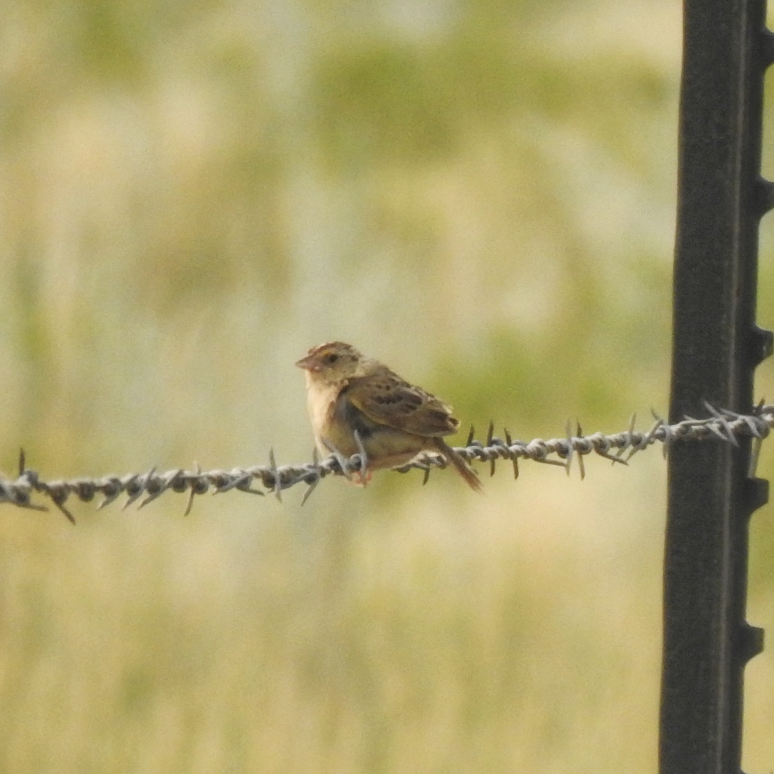 I looked at a photo of the bird another guy took when it was on the fence post. It was definitely a Baird’s Sparrow. I saw a Baird’s Sparrow. But I only identified it from a photo. I never saw an actual bird well enough to identify. Here’s the very bird I saw, five minutes before I saw it flying. I stole this off the internet.