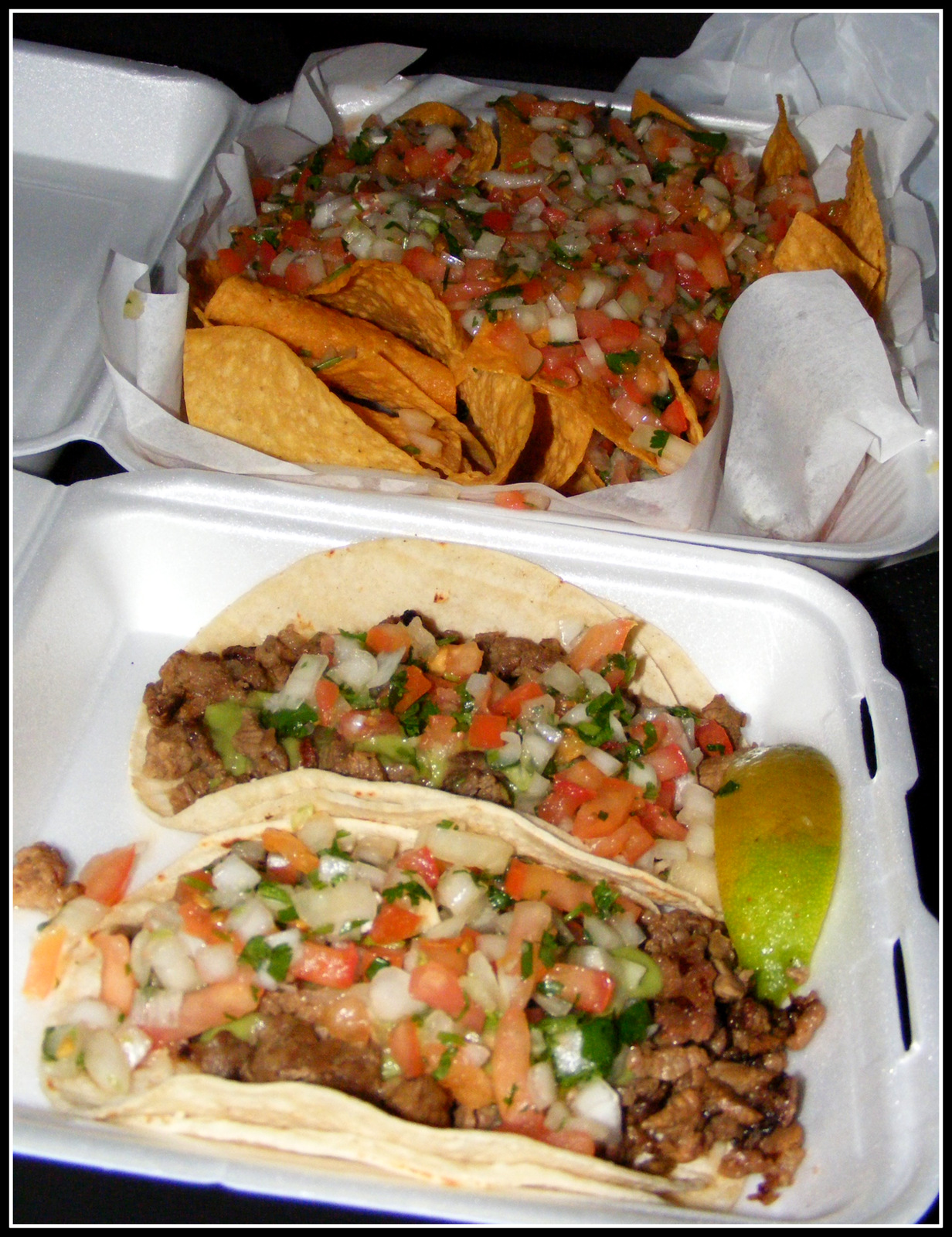 As I drove by, I noticed a trailer parked next door. It wasn’t very well lit either, but I could see a lighted window and another “open” sign. I circled the block and pulled in. A pleasant Mexican man greeted me and recommended the beef tacos. I ordered two, and a side of chips and salsa.