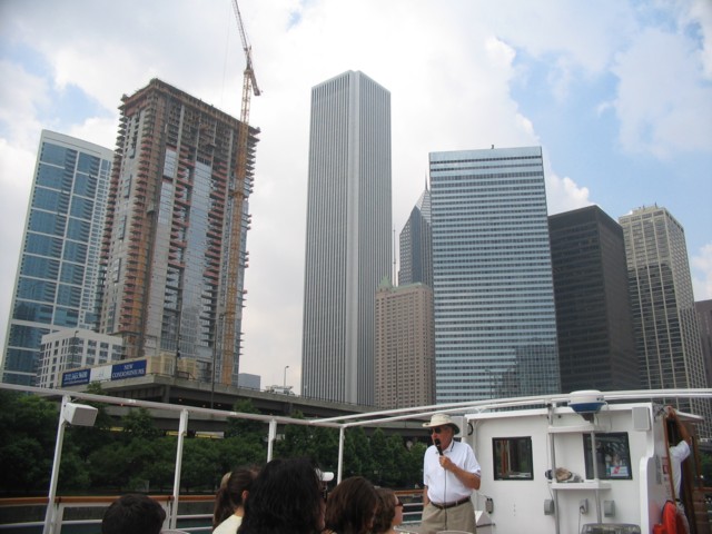 After a mad dash by river taxi, regular taxi and foot, my coworkers and I made it to the boat dock at Navy Pier a couple of minutes before the tour left. It was a hot, sunny day (at this point, anyway), but we found seats on the upper deck.