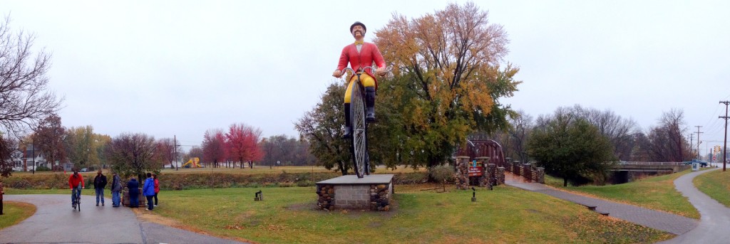 When the group finally tore themselves away from coloring, we drove a few blocks to see Ben Bikin’. Sparta considers itself to be the “Bicycling Capital of America” because the first railroad bed converted to a bike path in Wisconsin runs through the town. This big guy rides in a park along a main intersection.