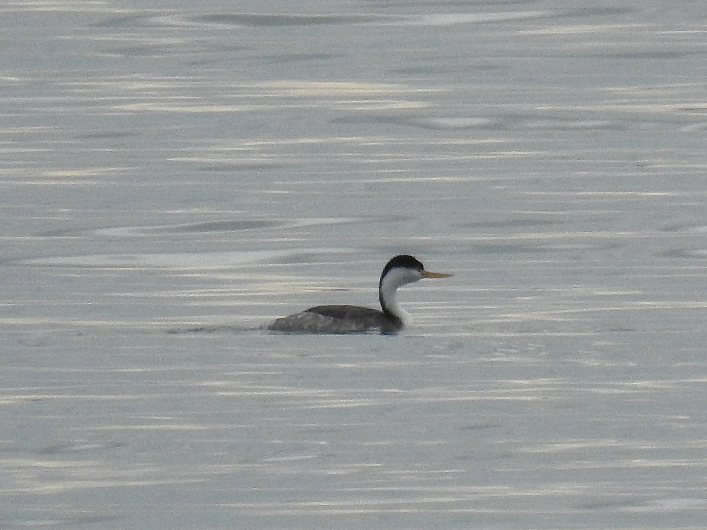 And then I saw a black-and-white grebe. It was a long way off, but I could tell it wasn’t a Horned Grebe. Western Grebes are seen in Arkansas from time to time, so that’s what I called it.  It drifted closer, and I got some lousy photos and sent out a notice to the rare bird email group.
