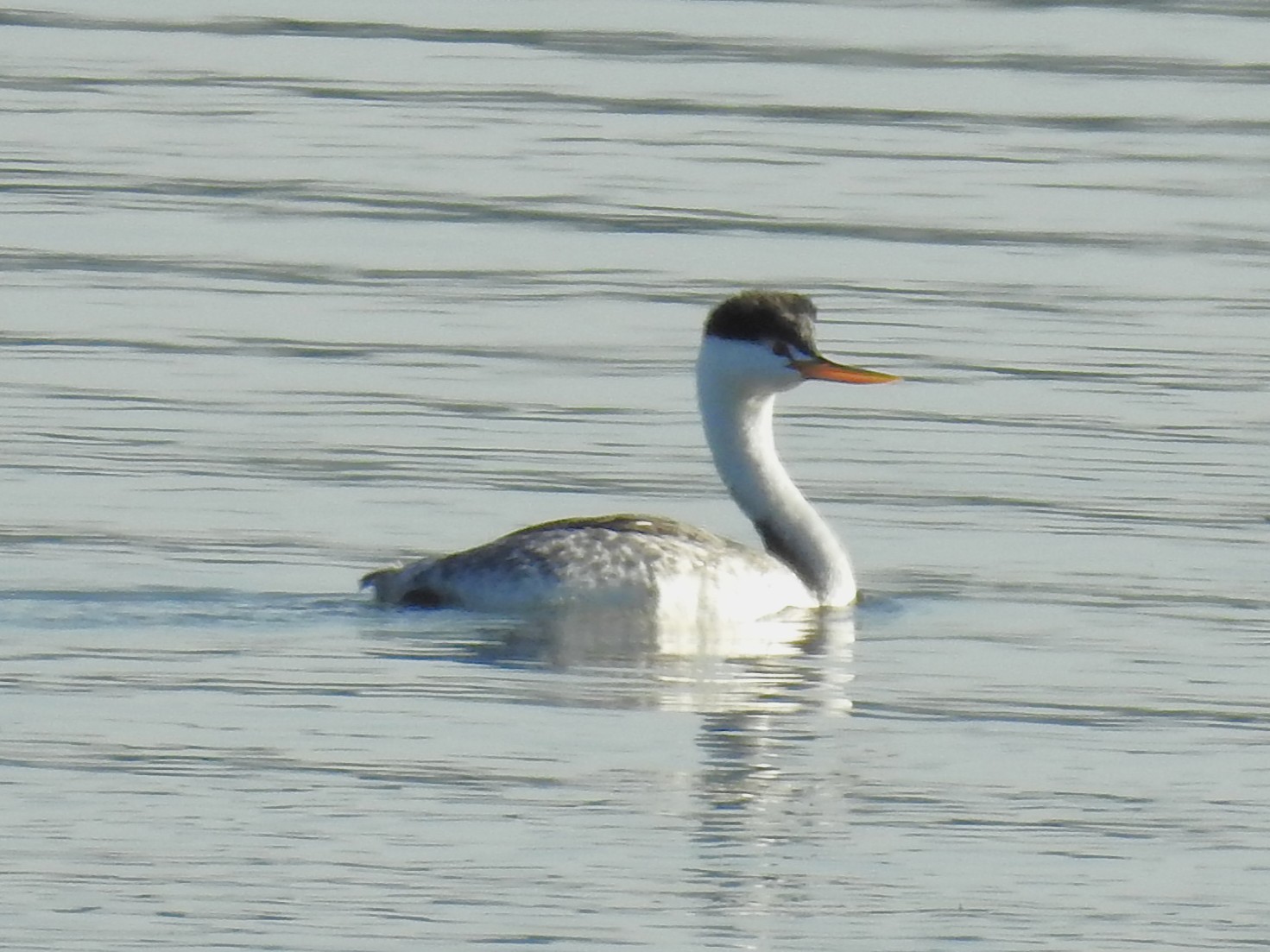 I was there about an hour when Kenny and his wife showed up along with Michael and Patty, two other local birders. By this time, the grebe had drifted a mile away to the far side of the lake. We flagged down a passing fisherman and convinced him to take Michael — because he has the best camera — across the lake for a better look. While we yelled confusing instructions into a phone, Michael and the boater tried to find the grebe. It all got a little frustrating and hilarious before it was over, but Michael got several definitive photos that prove it was indeed a Clark’s Grebe.