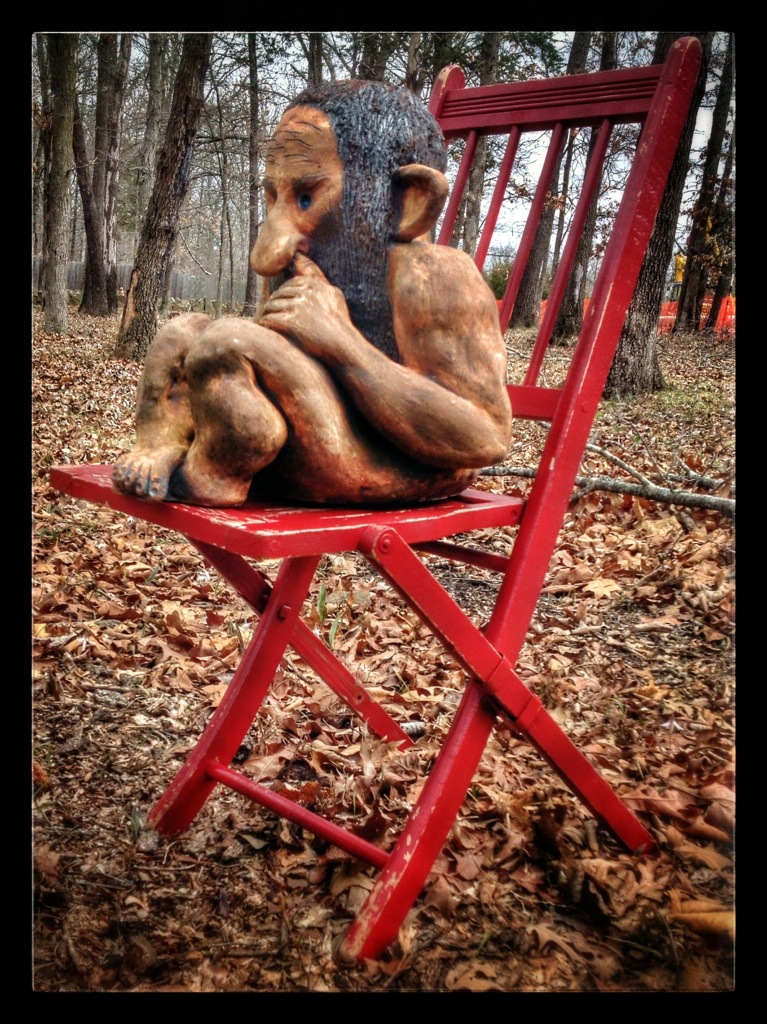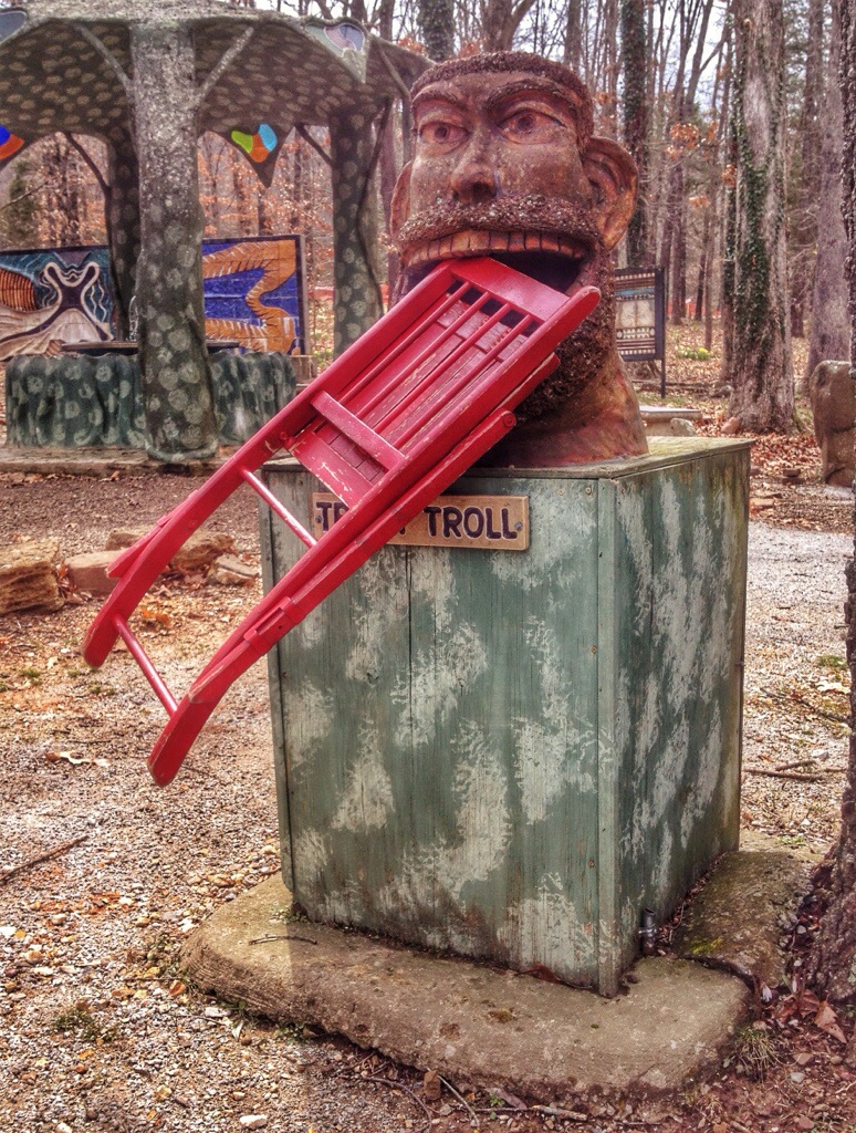 This nose-picking troll was sitting on a stump. I moved him to the chair. He never took his finger out of his nose.