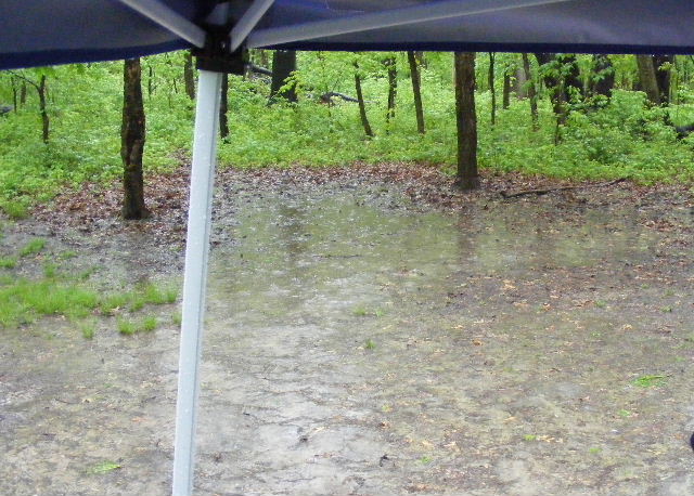 When others arrived, there wasn’t room on the table, so we gave up on keeping it dry and moved the canopy to the lone spot of high ground in the campsite and discussed the future. We decided we weren’t going home, no matter what. But while we didn’t mind camping in the rain, setting up camp in the rain was a different story. So now what?