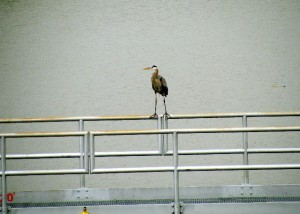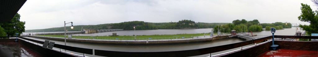 We stood under the overhang on the deck and watched the rain. An occasional Great Blue Heron or Double-crested Cormorant flew by and fish were constantly leaping high above the water in the lock. In the panorama below, Starved Rock is the outcropping across the river on the right.