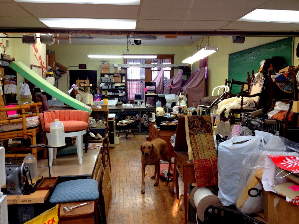 I followed her into the building, which is now an upholstery shop. The inside was interesting — a narrow aisle led between piles of chairs and fabric. A large dog came walking to greet us, then settled back on its bed and ignored me.
