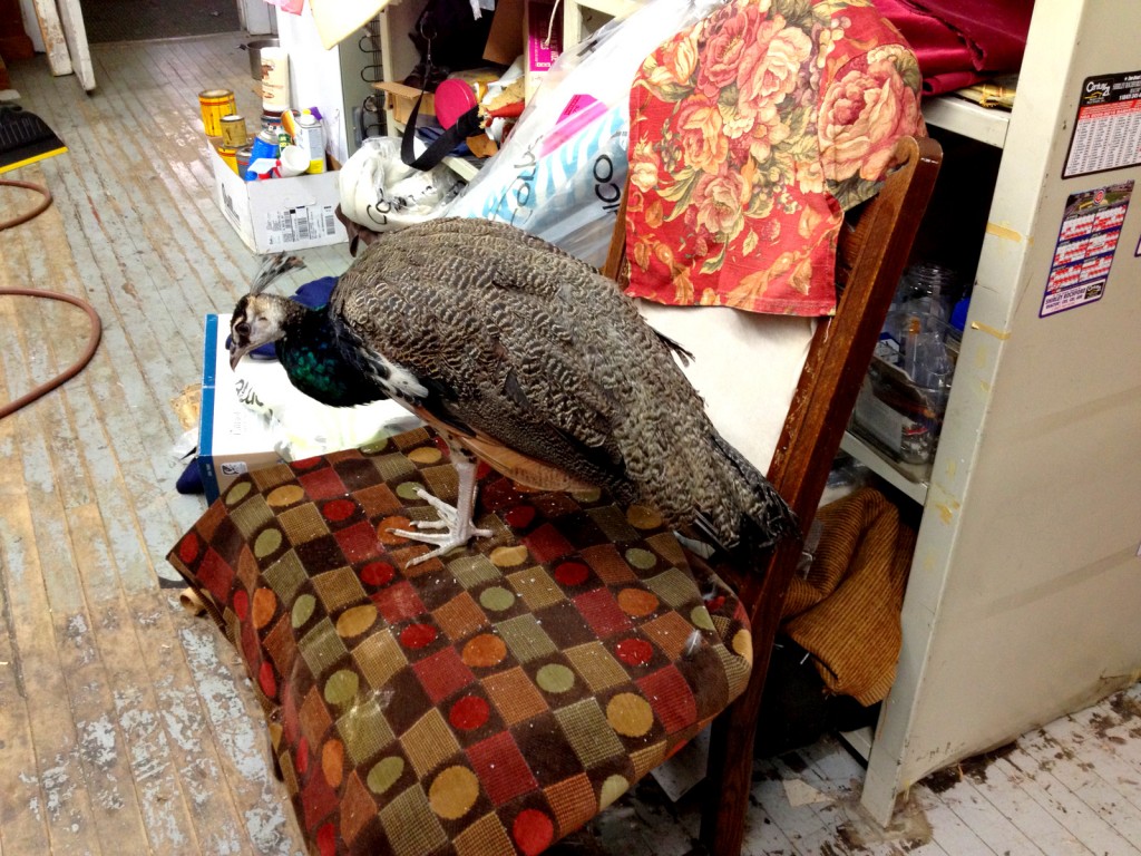 As we were talking, I heard footsteps coming from the meat market side of the building. The woman got a sheepish look on her face. She stepped aside and there, in the aisle behind her, was … a peacock.