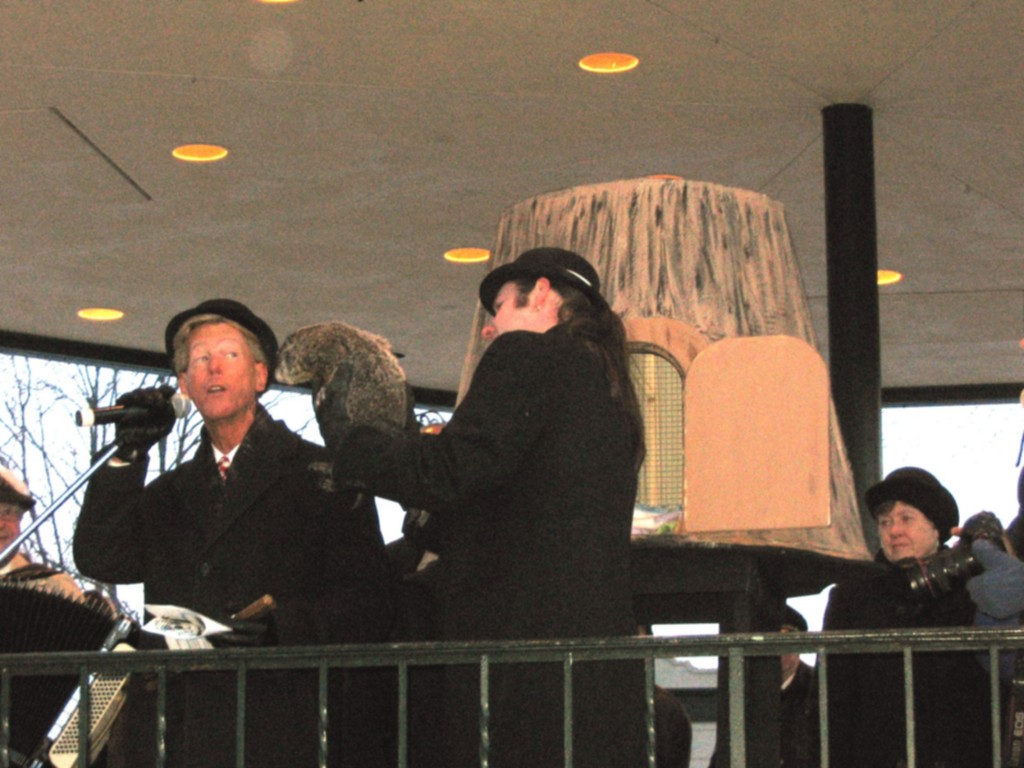 The mayor of Woodstock took the mike while the groundhog wrangler brought Willie out of his stump. He held the critter up to the mayor’s cheek. The mayor stepped back to confer with the other officials, then announced Willie’s verdict (using the same script as in the movie).
