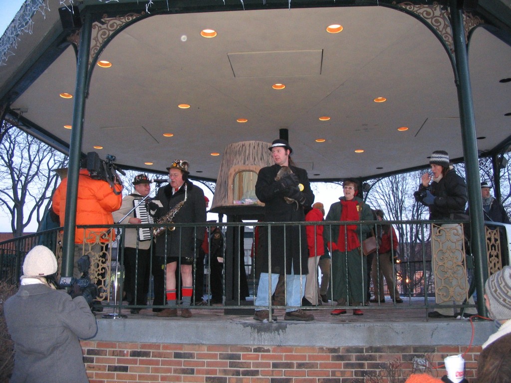 The ceremony took place in the gazebo, not on a separate stage like in the movie. A polka band filed up, including a guy in lederhosen with bare knees. A guy in a groundhog costume followed with a police escort. The band played (poorly) the Pennsylvania Polka, the song that was playing in the movie, then the band leader and the mayor sang a duet of Take Me Out of the Tree Stump.