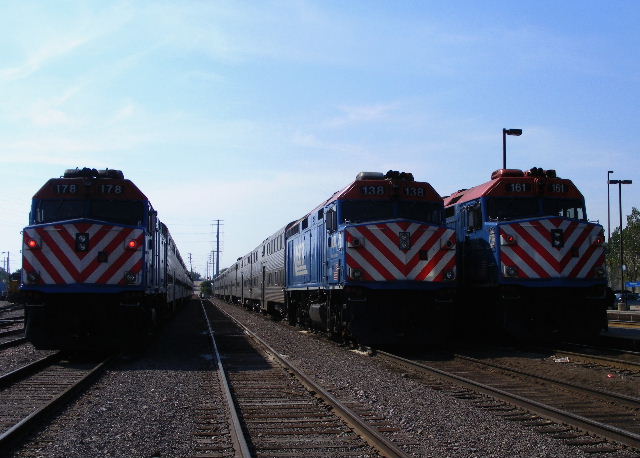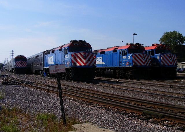 I have no idea why, but for the entire time I was in the area, several of these engines were running. I wonder how much gas money that cost somebody … A Metra station was right next to the Union Pacific yard. I wondered as I wandered whether somebody would ask me what I was doing or tell me to get lost, but none of the very few people I saw even looked at me. I could have gotten a whole lot closer than I did.