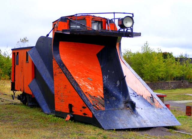 We wandered about Calumet for a little while, looking for something to look at. The National Park Service owns several buildings in town, but none of them were open. A kind woman who spotted us trying to enter a locked building gave us a pile of brochures and recommended we tour the Quincy Mine. It looked interesting, but since it was 15 miles behind us, we decided to hit it in the afternoon. This old train/plow was one of several bits of decaying mining and railroad equipment that was scattered around town.