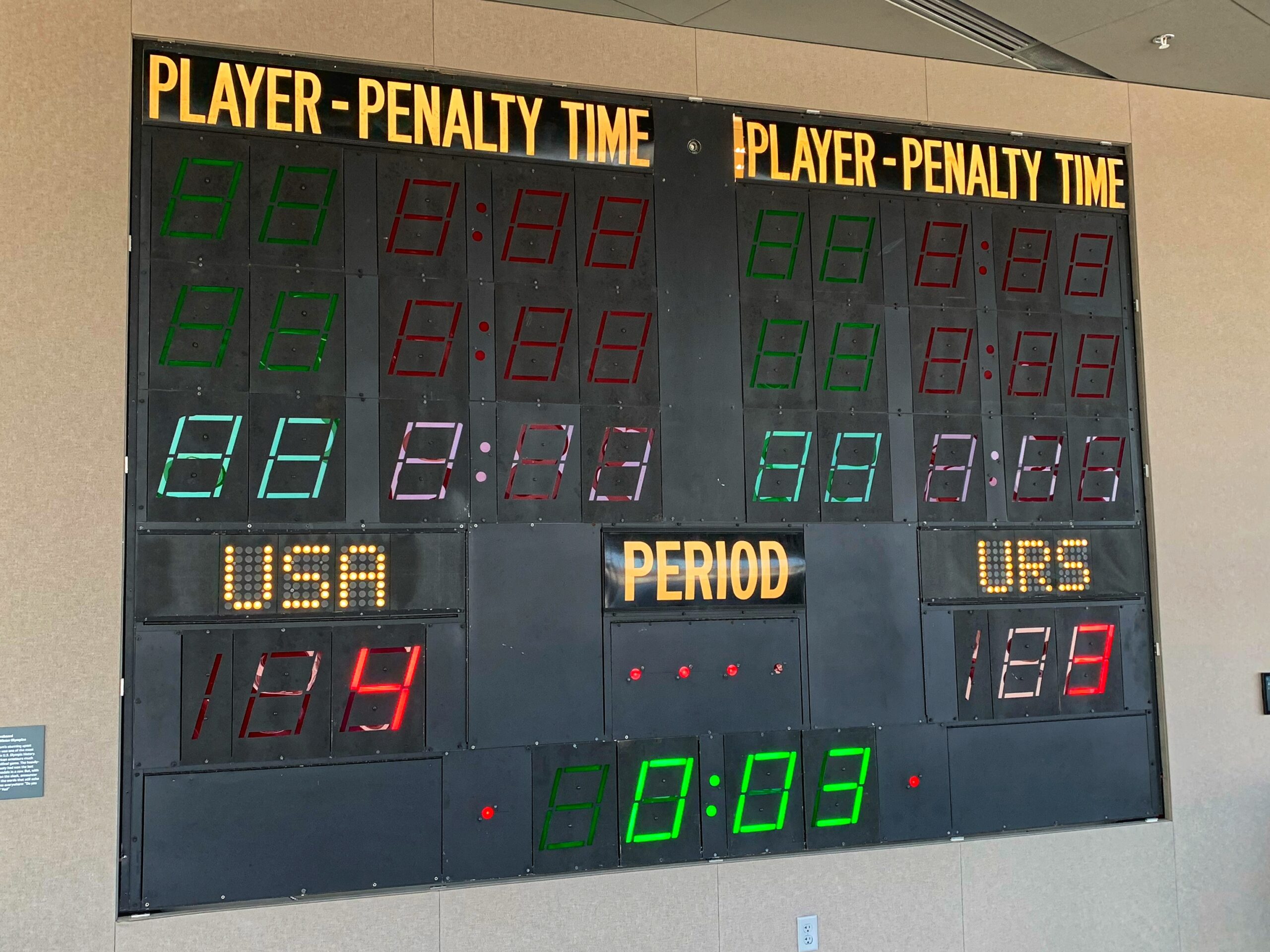 Here’s the 1980 “Miracle on Ice” hockey scoreboard, frozen at the moment when the broadcaster said, “Do you believe in miracles?” A lot of the exhibits demonstrated this air of overblown historic significance.