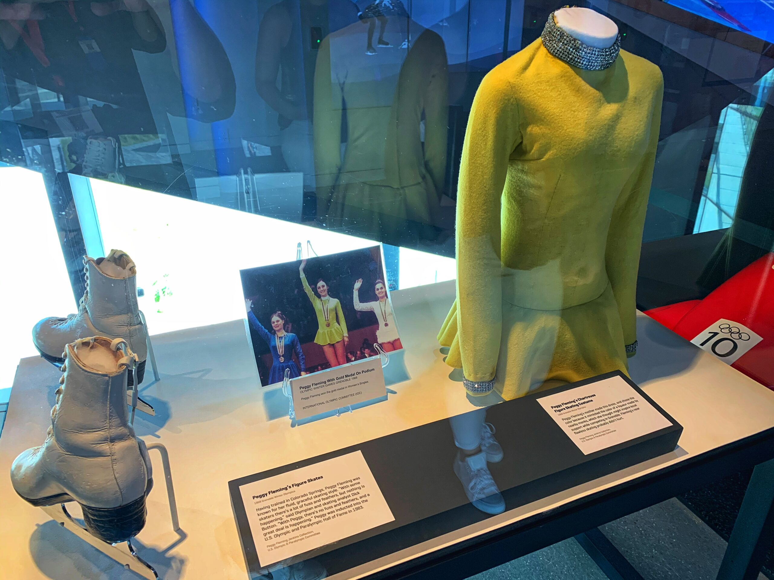 But the vast majority of exhibits were either pieces of equipment used by various athletes or reproductions of items connected to Olympic history. For example, here’s Peggy Fleming’s dress which her mother made to match the color of the liqueur made by monks near the ice-skating venue in hopes of influencing the voting. Really, that’s what the sign said.
