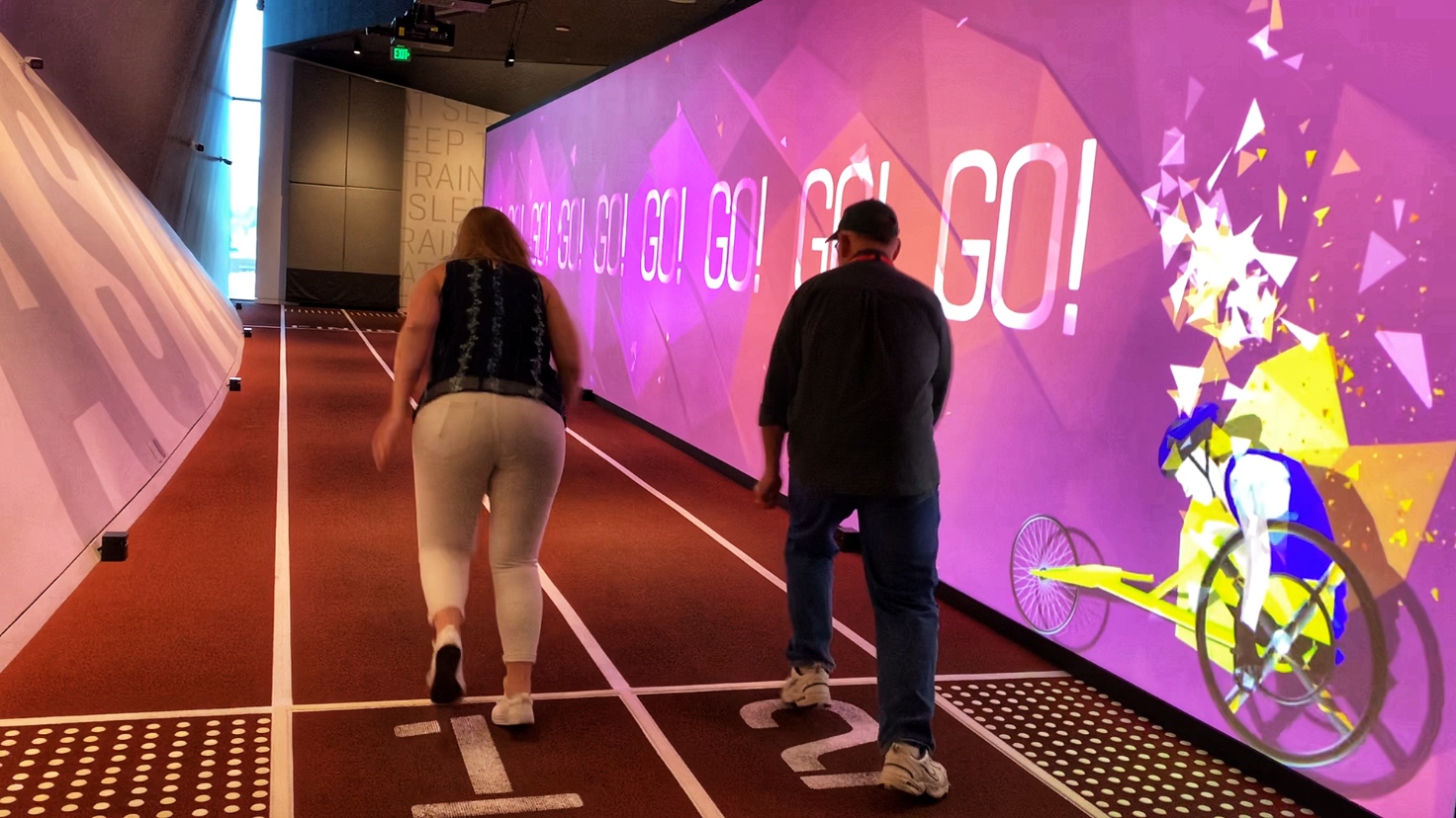 In one room, there were several interactive opportunities to compete, but they weren’t terribly fun or impressive. Here I am with a coworker racing against a wheelchair sprinter. I came in second.