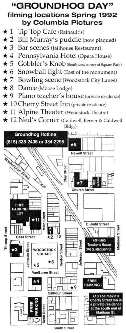 Sites 1 and 2 — The Tip Top Cafe (which was an empty store front mocked up for the movie) and Bill Murray’s puddle. The hole in the street has been filled in and, in fact, a small curbed area now covers the spot. There is a plaque (above) to mark it. (No picture.)