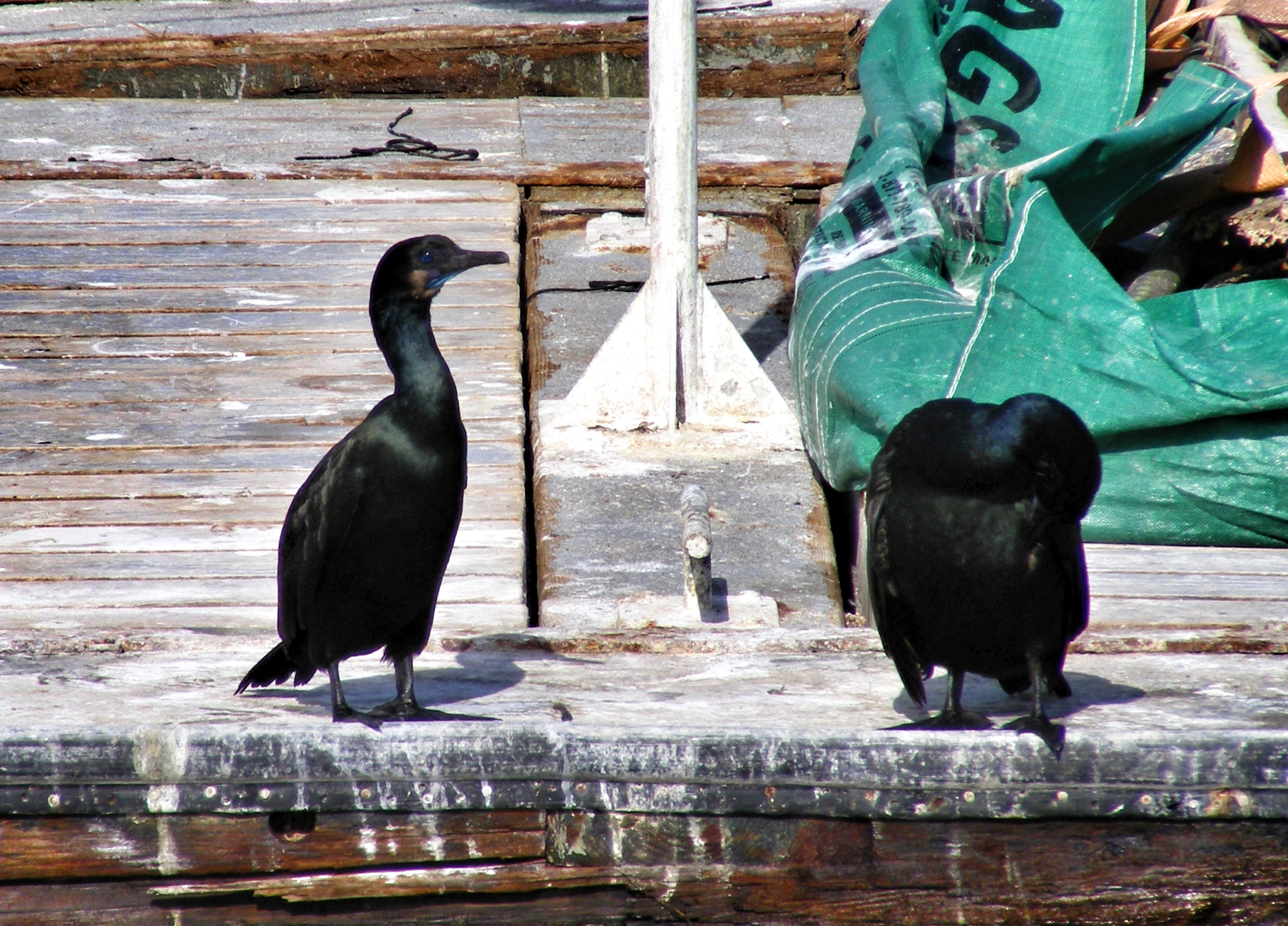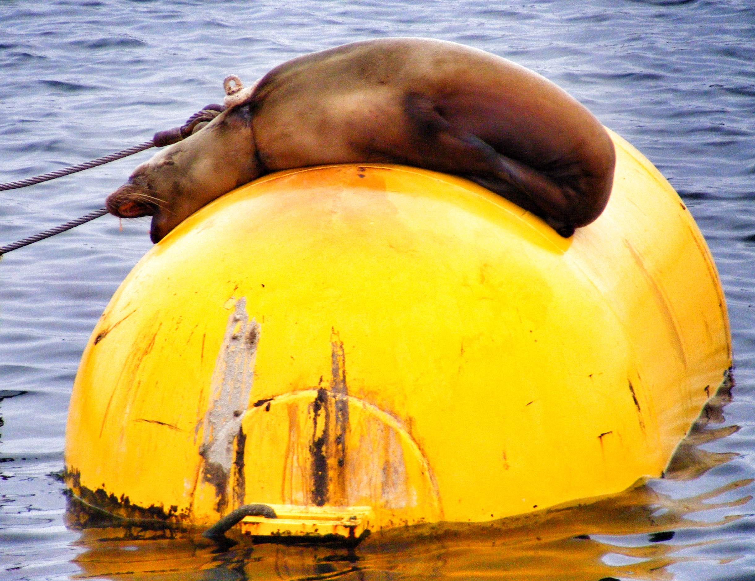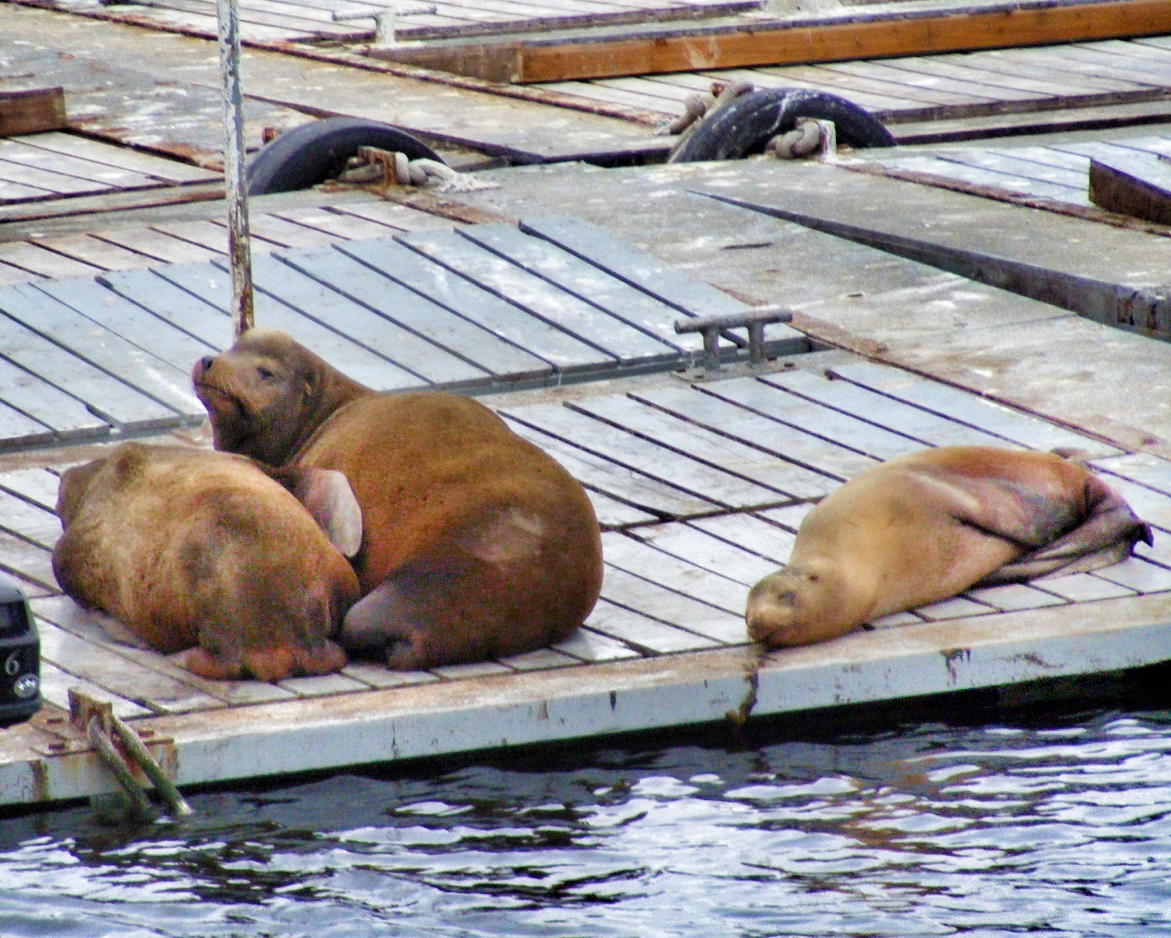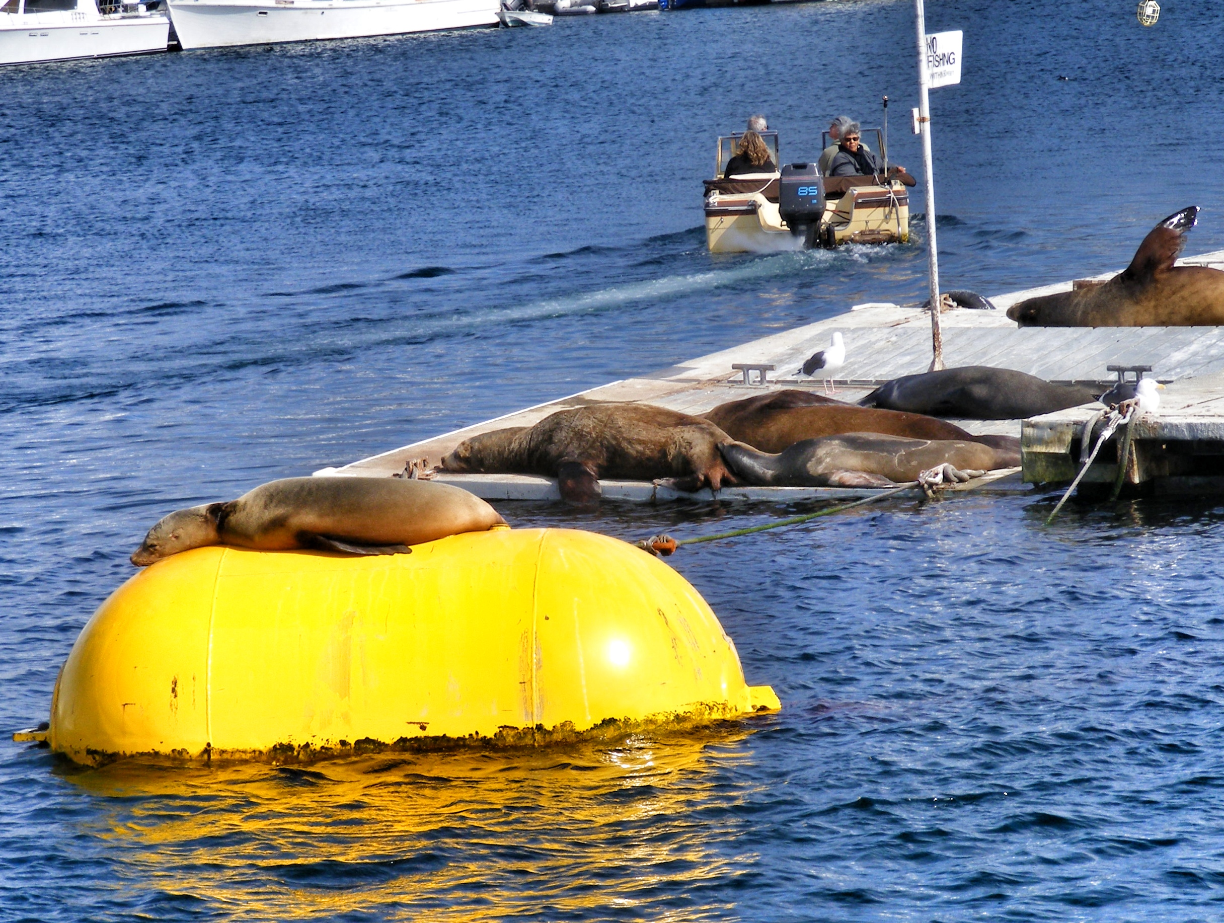 As we headed out of Mission Bay, the marine biologist got on the intercom and told us what we were looking for. We passed a floating dock in the harbor, and she pointed out the wildlife resting on it.