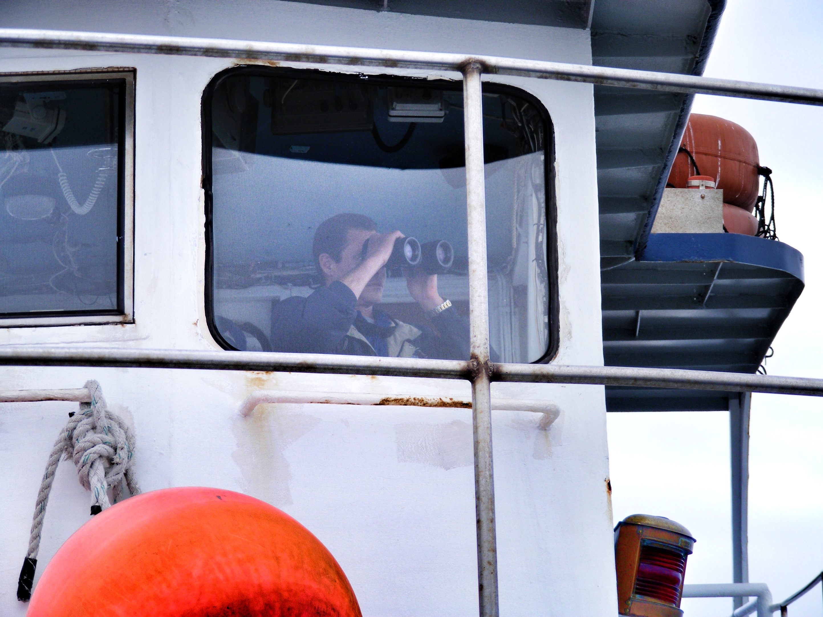 We were told to watch for splashes — a sign of whales and dolphins. As we got further and further out, more and more people quit looking and went inside. Here’s the captain searching for whales. We were told there was a whale four miles away, but there were already six boats hovering around it and the legal limit for one whale is four boats, so we stayed in our area.