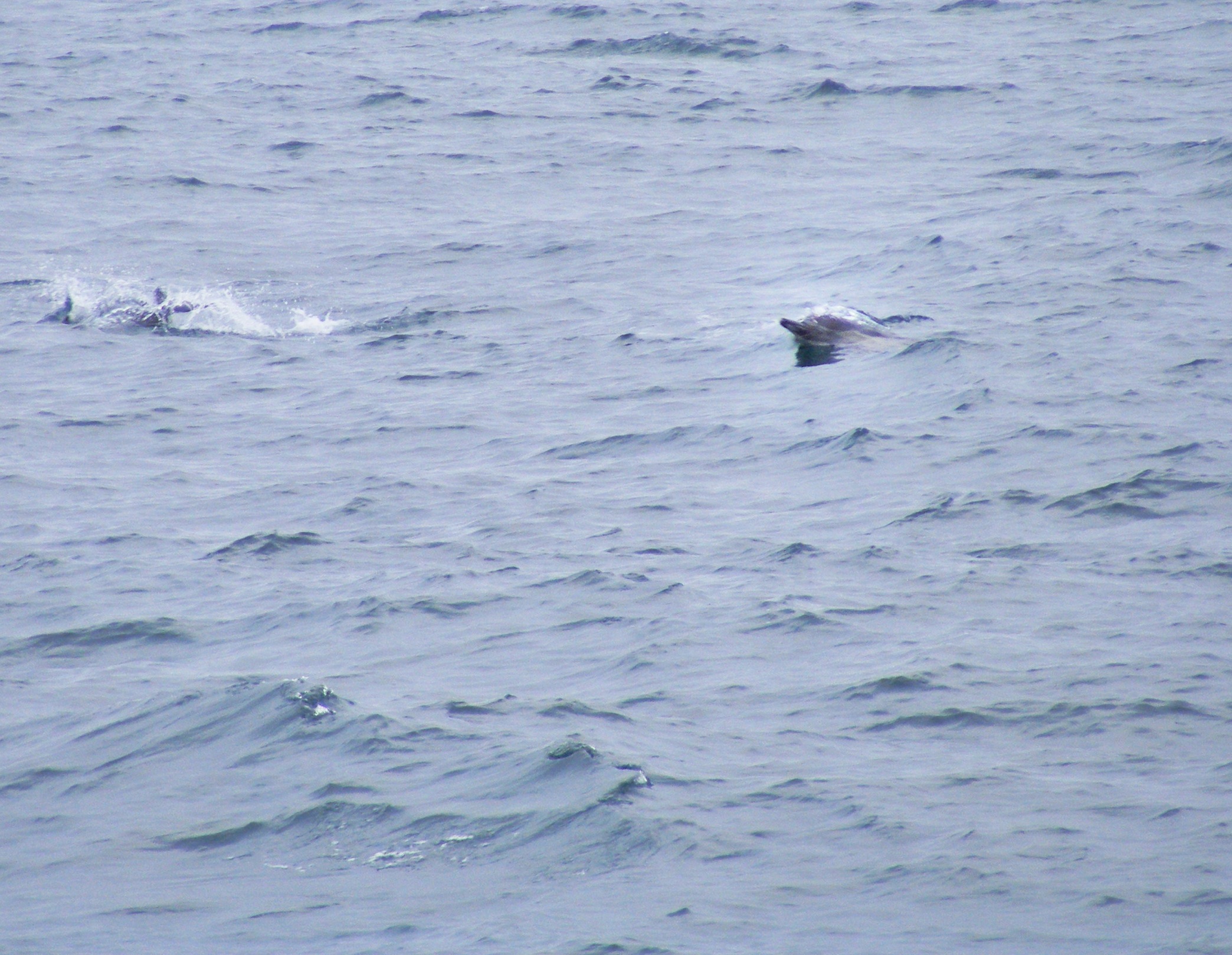 Everybody had given up all hope. I had returned to the lower deck to chat with a friend when the boat turned and I saw a large flock of birds in the distance. I knew it was something interesting, so I dashed back top and found a good place on the railing just as Melissa came over the intercom and reported that they’d found a pod of Common Dolphins. We could see them surfacing in the distance, and as we raced toward them, they raced toward us.