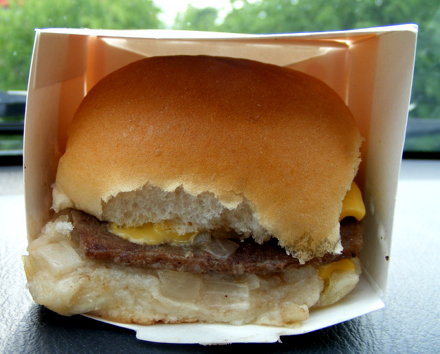 I took it out of its tiny box. It looked gray. It felt soggy. The bottom bun was mushy, like it had been sitting in warm water for an hour or so. I braced myself and took a bite. It tasted gray and soggy. Even the tiny slice of pickle was soggy. My daughter and I both had a tough time getting them down and we both felt rather ill afterwards.