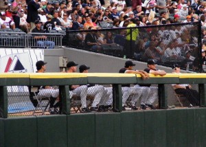 Our seats were just four rows up from the field down the third-base line near the foul pole. We had a fantastic view of the left fielder, but had to twist our necks quite a bit to see home plate.