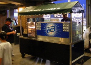 One last bit of excitement. I decided it was time I had my first funnel cake. I waited until the fifth inning to let my pregame Polish sausage settle, then went to the concourse to a booth called The Funnel Cake Factory. I paid my $4 and returned to my seat to experience the thrill.
