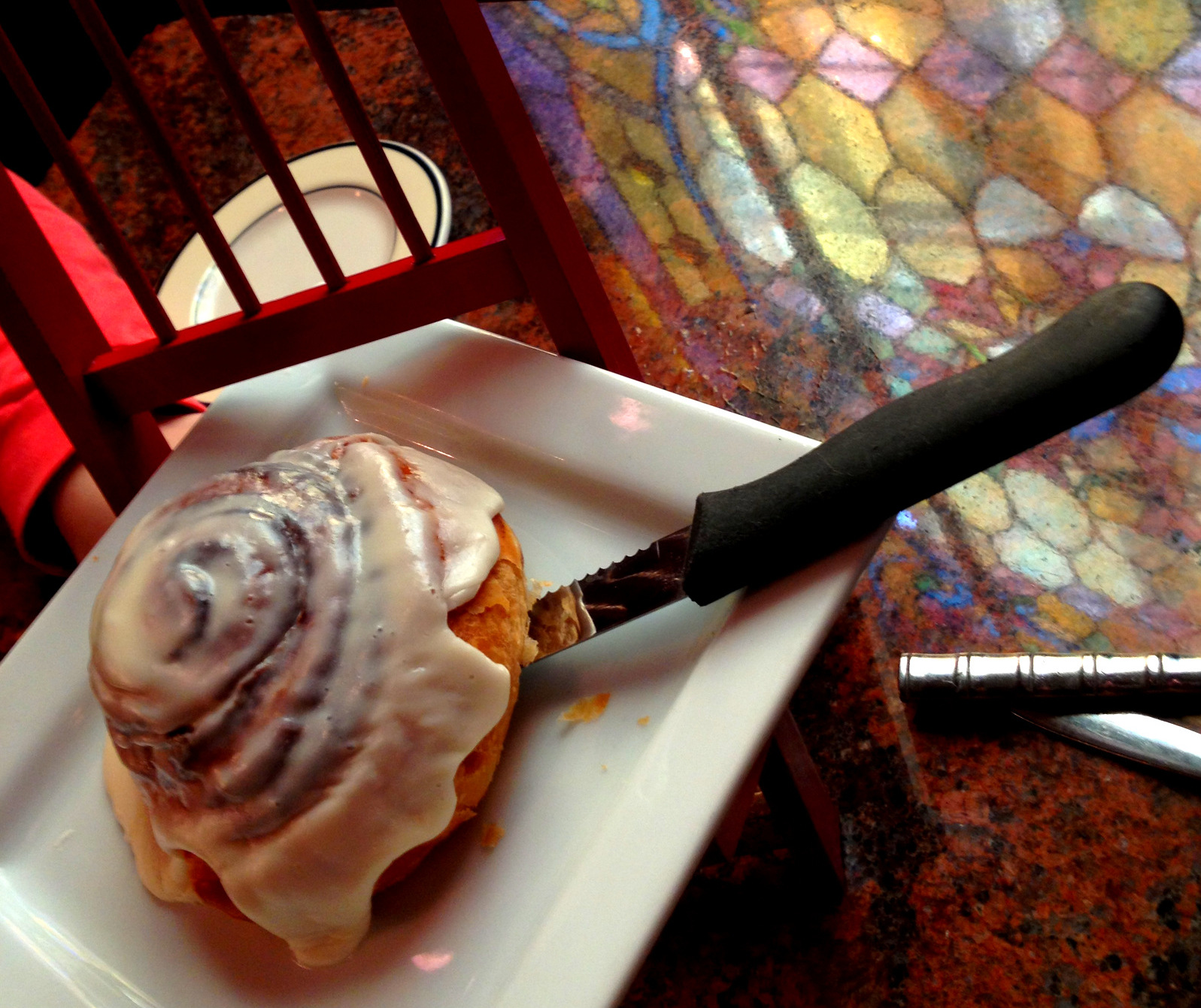 The menu boasted of “best cinnamon buns in the universe,” so we ordered one of those and split it.