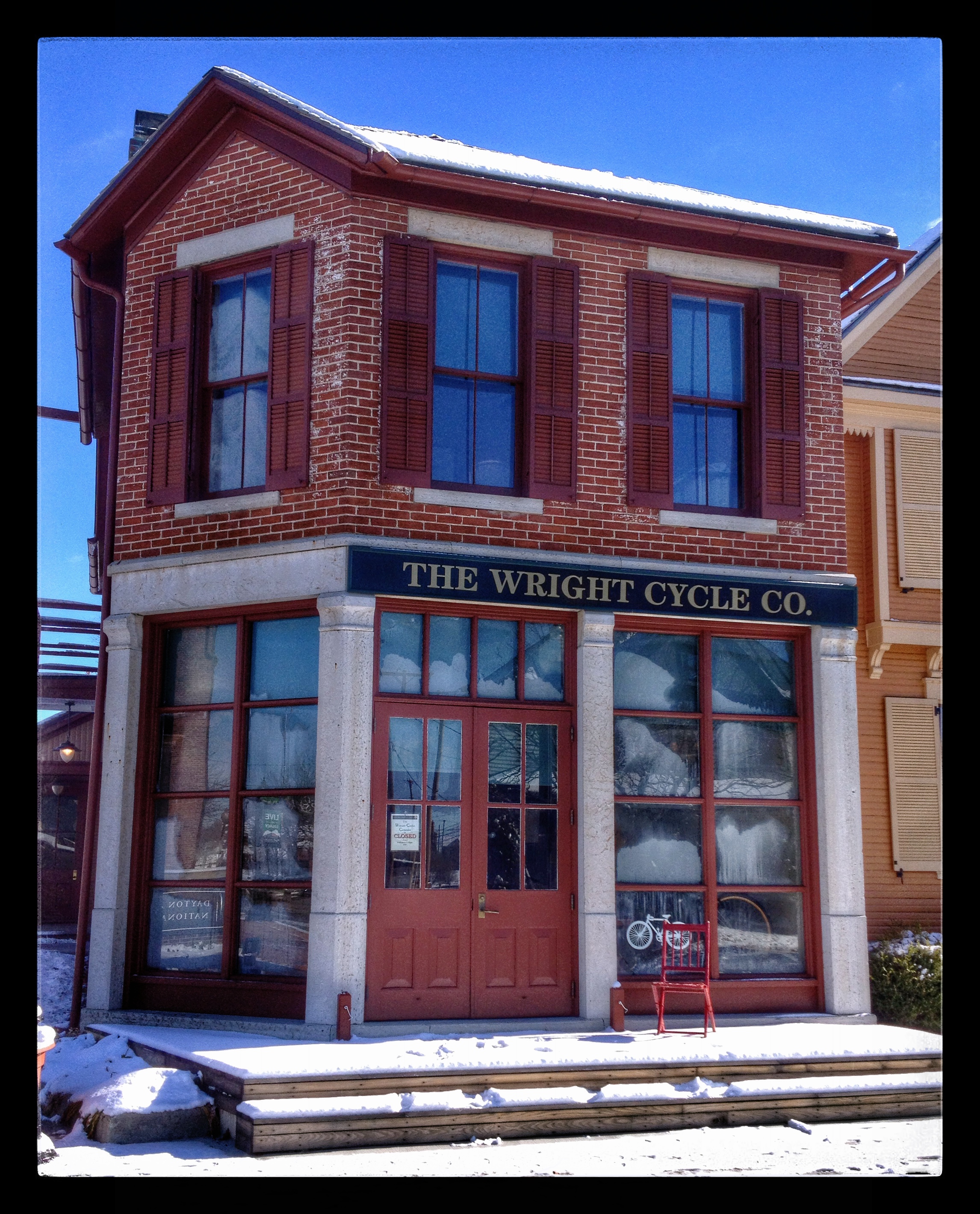 Wrong. We checked. I took a quick photo of The Wright Cycle Company, one of the actual buildings in which the brothers operated their business. They worked here from 1895 to 1897. (The building in which they actually designed their plane has been moved to Greenfield Village in Michigan.)