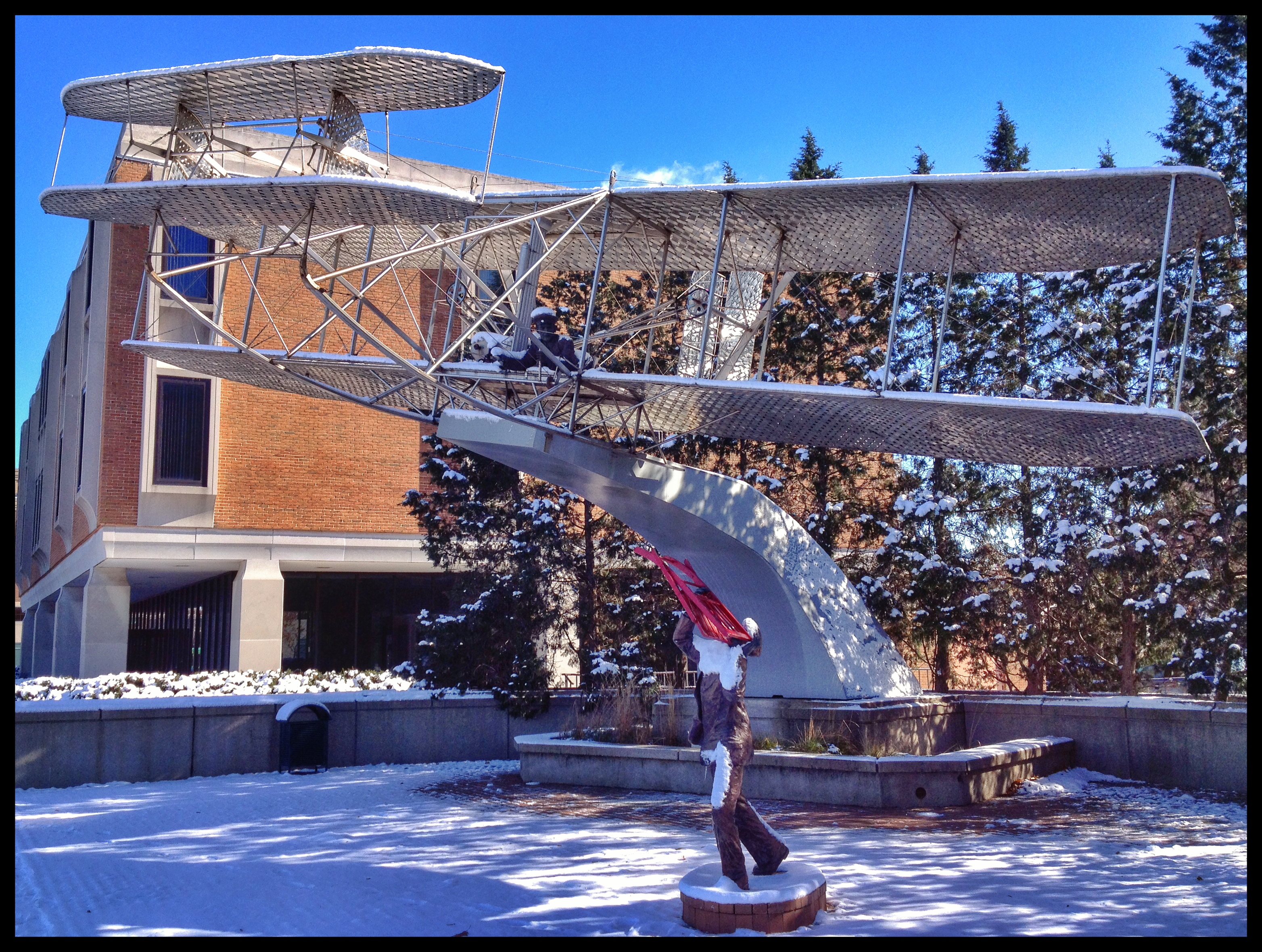 This one is next to the Dayton Engineers Club, built by a group of inventors from the city. Orville Wright was president for a while. A statue has been built next door, showing Wilbur flying the 1905 Wright Flyer while Orville runs alongside and tries to hand him a chair.