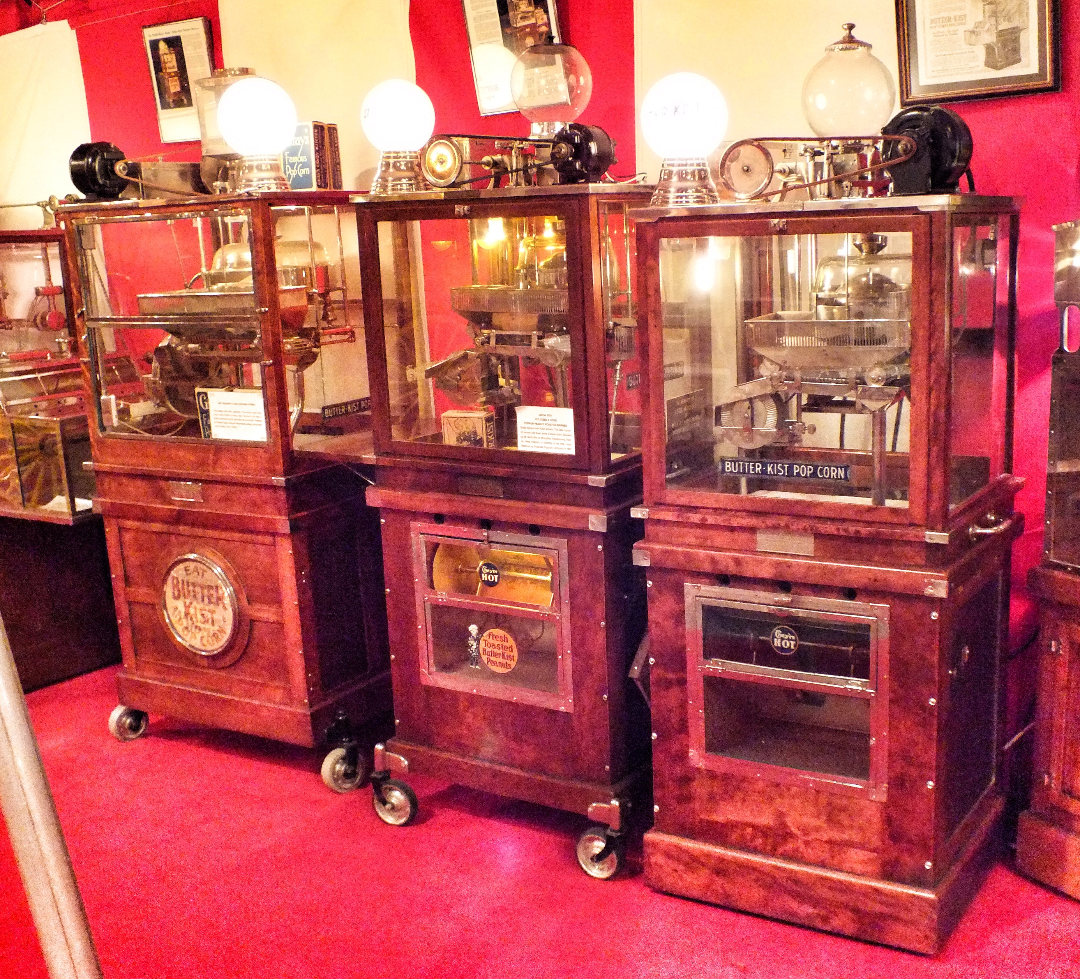 The blue-fronted machine on the right, a 1928 Star Advance “Profit” model, advertises “French-fried Popcorn.”