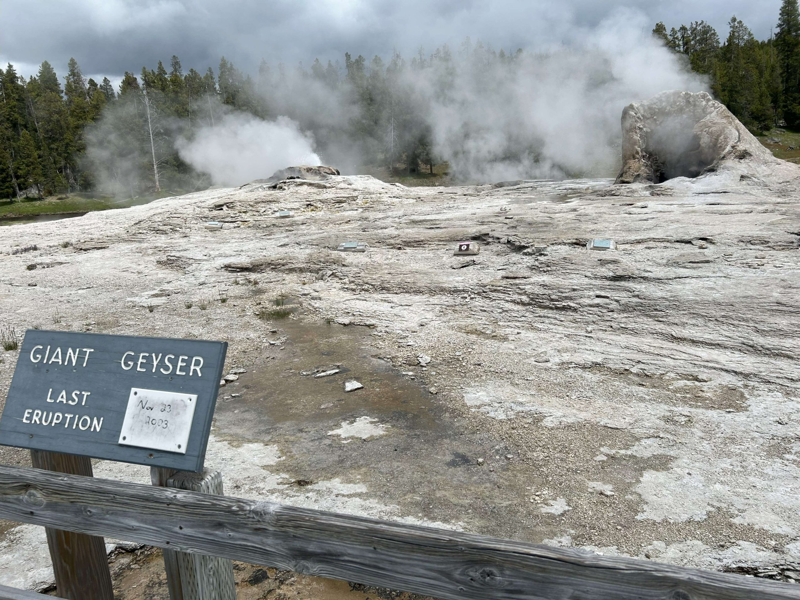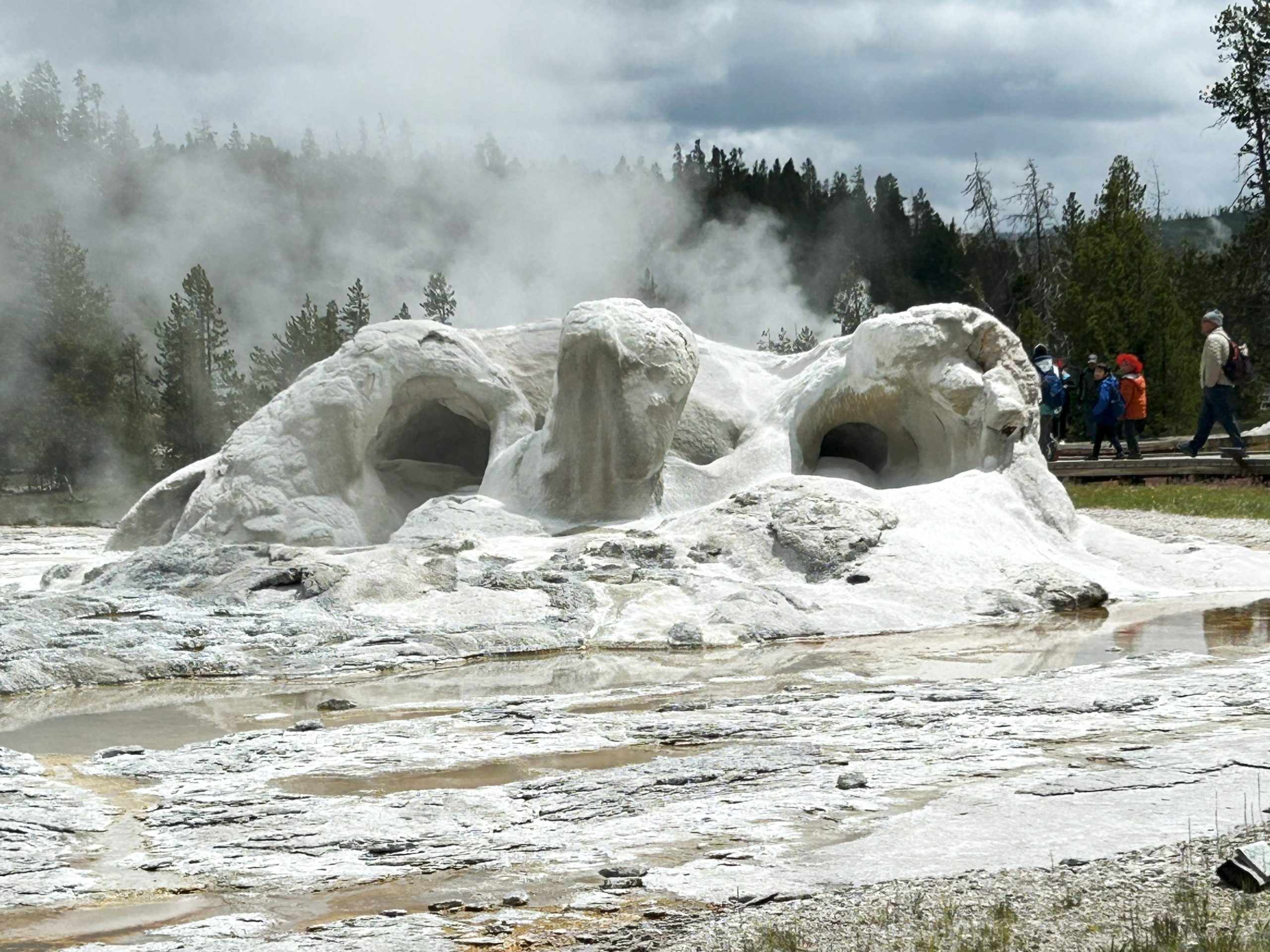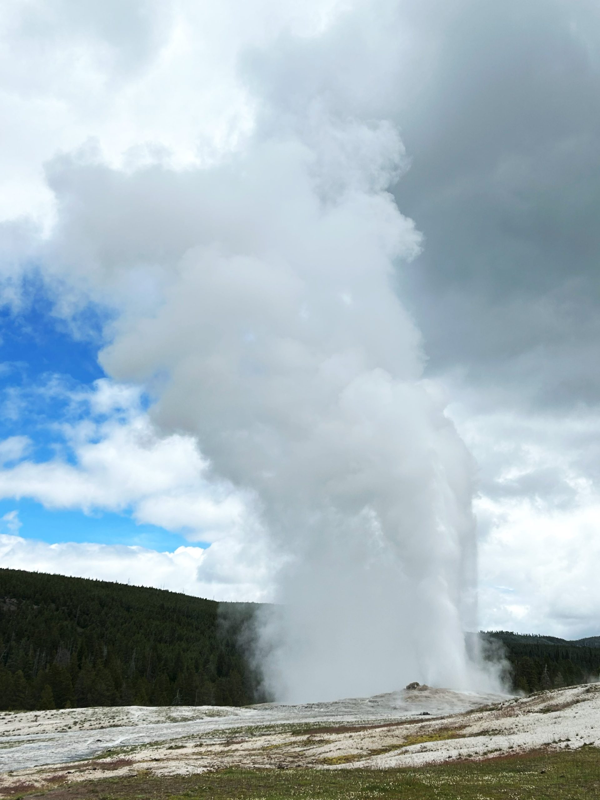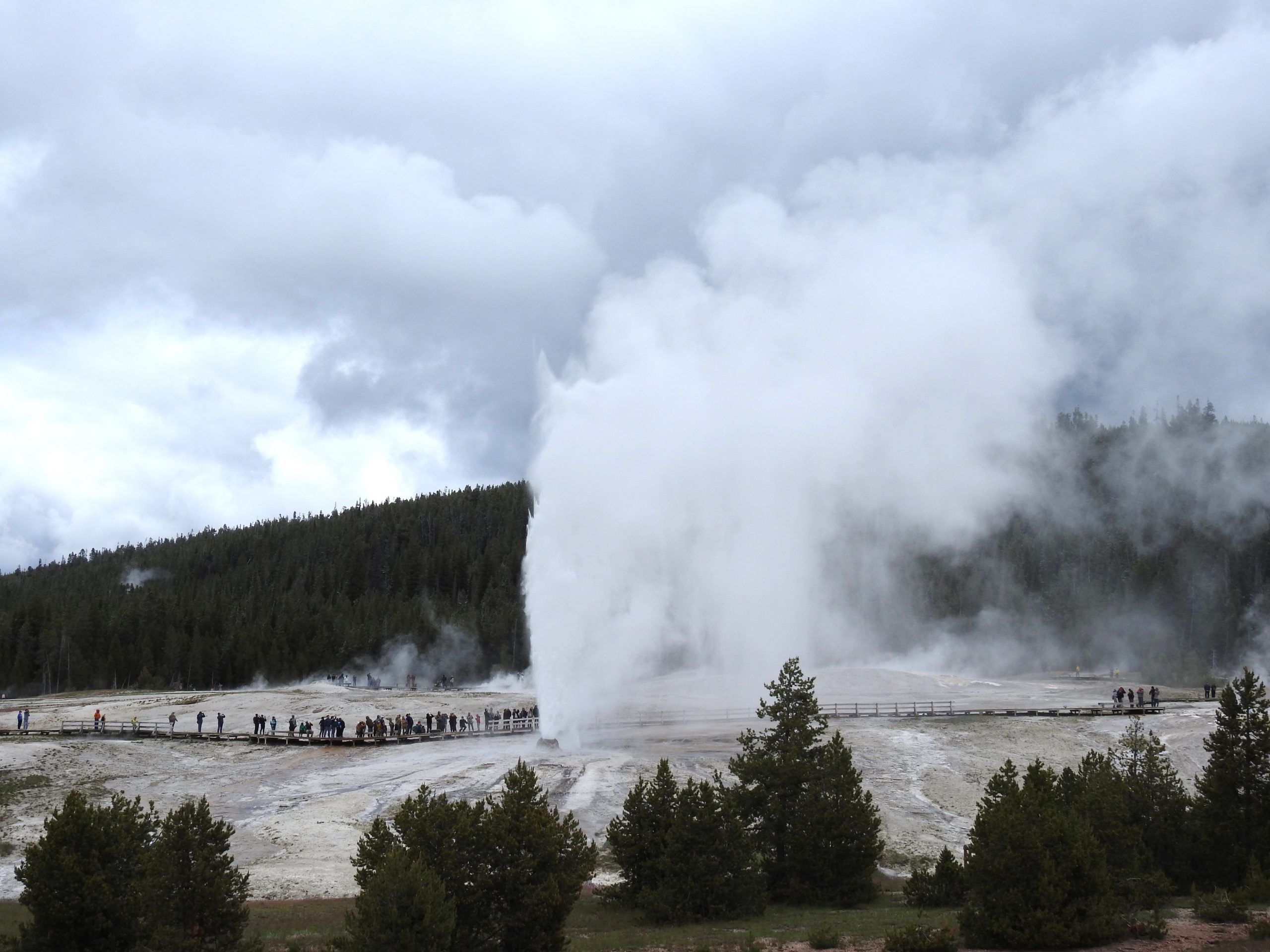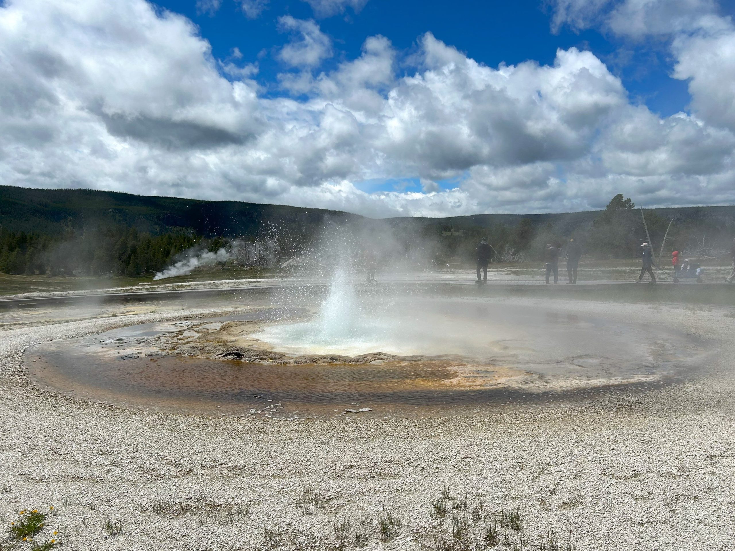 We were less than half an hour from Old Faithful’s next show. We found seats on one of the benches that circle half of the glacier. It began shooting up steam about 10 minutes before it erupted, and each time people went “oooooo!” By the time it went off, there were several hundred people watching. It was worth the show. A lot of hot water shot up in the air and a lot of steam spread over the area.