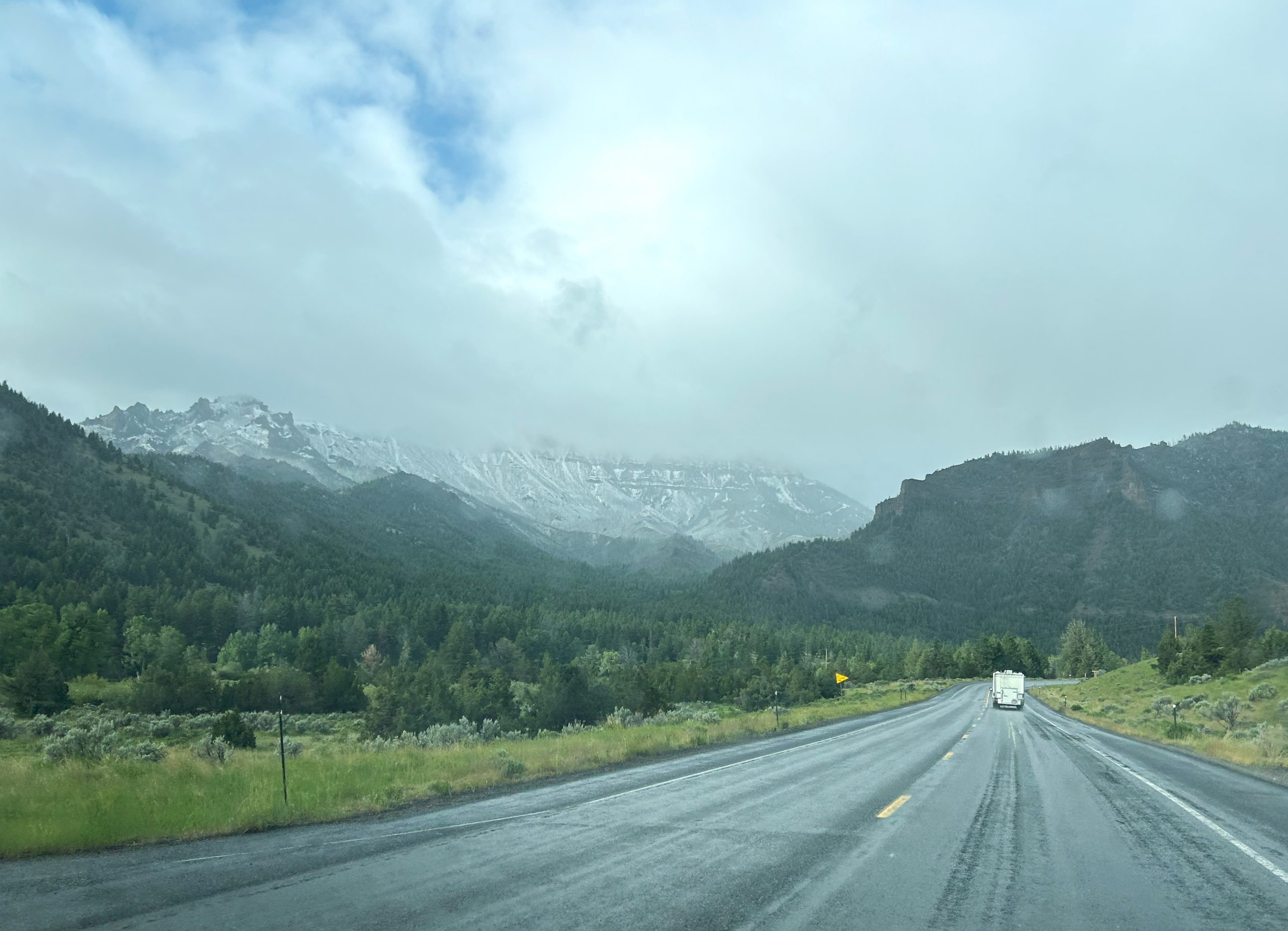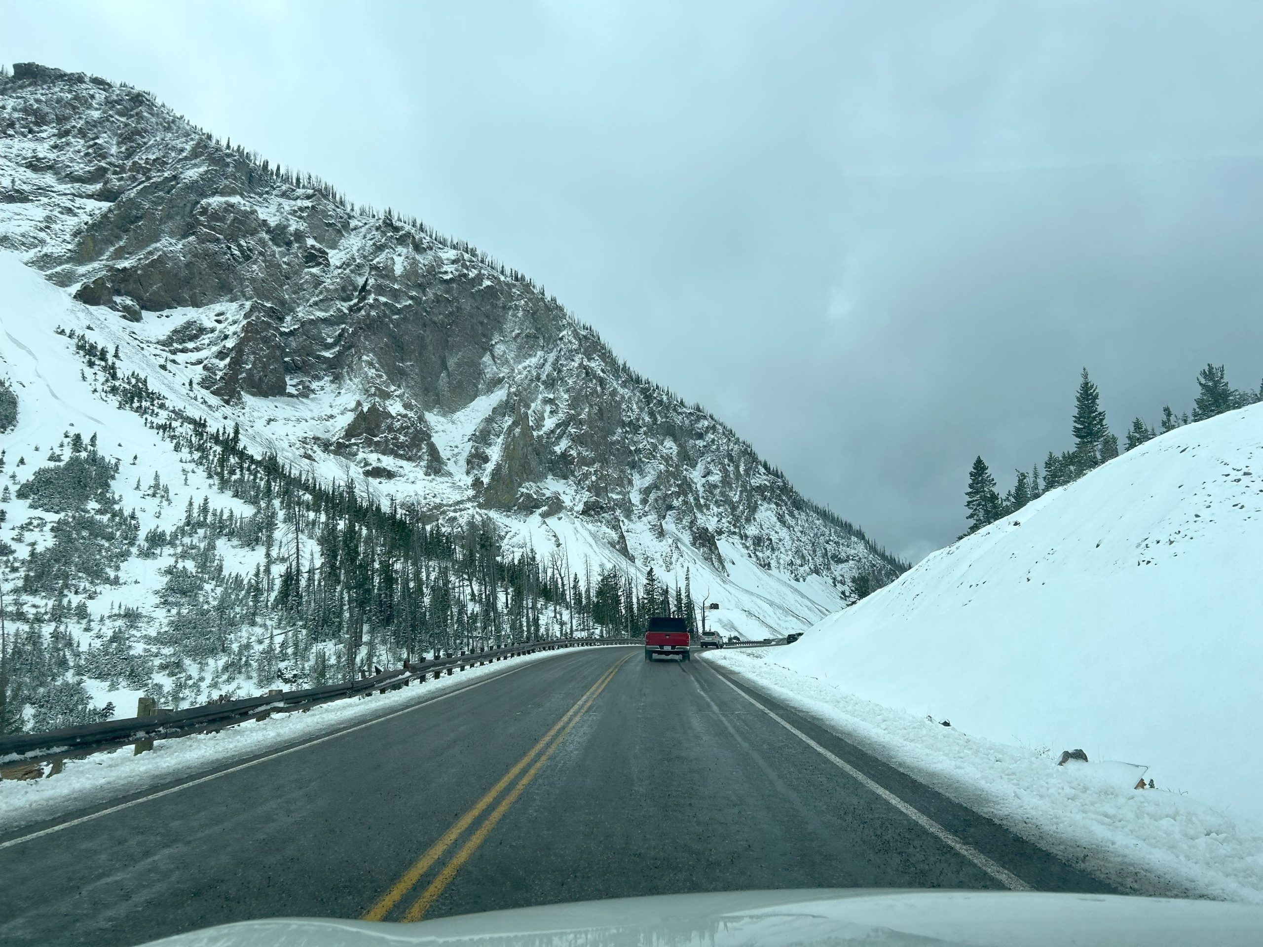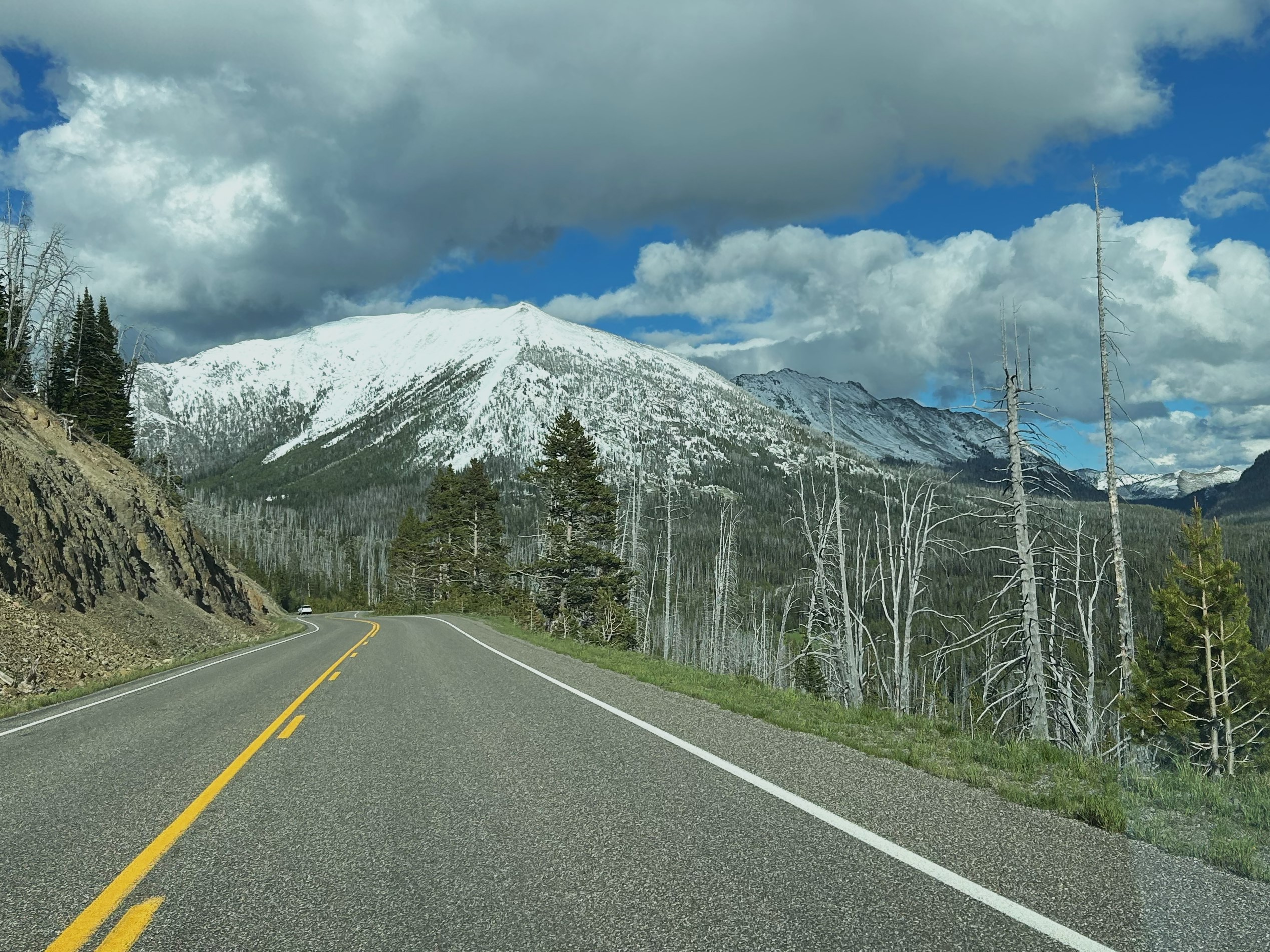 When we drove over Sylvan Pass (8,530 ft.) we could see where the snowplows had been working.