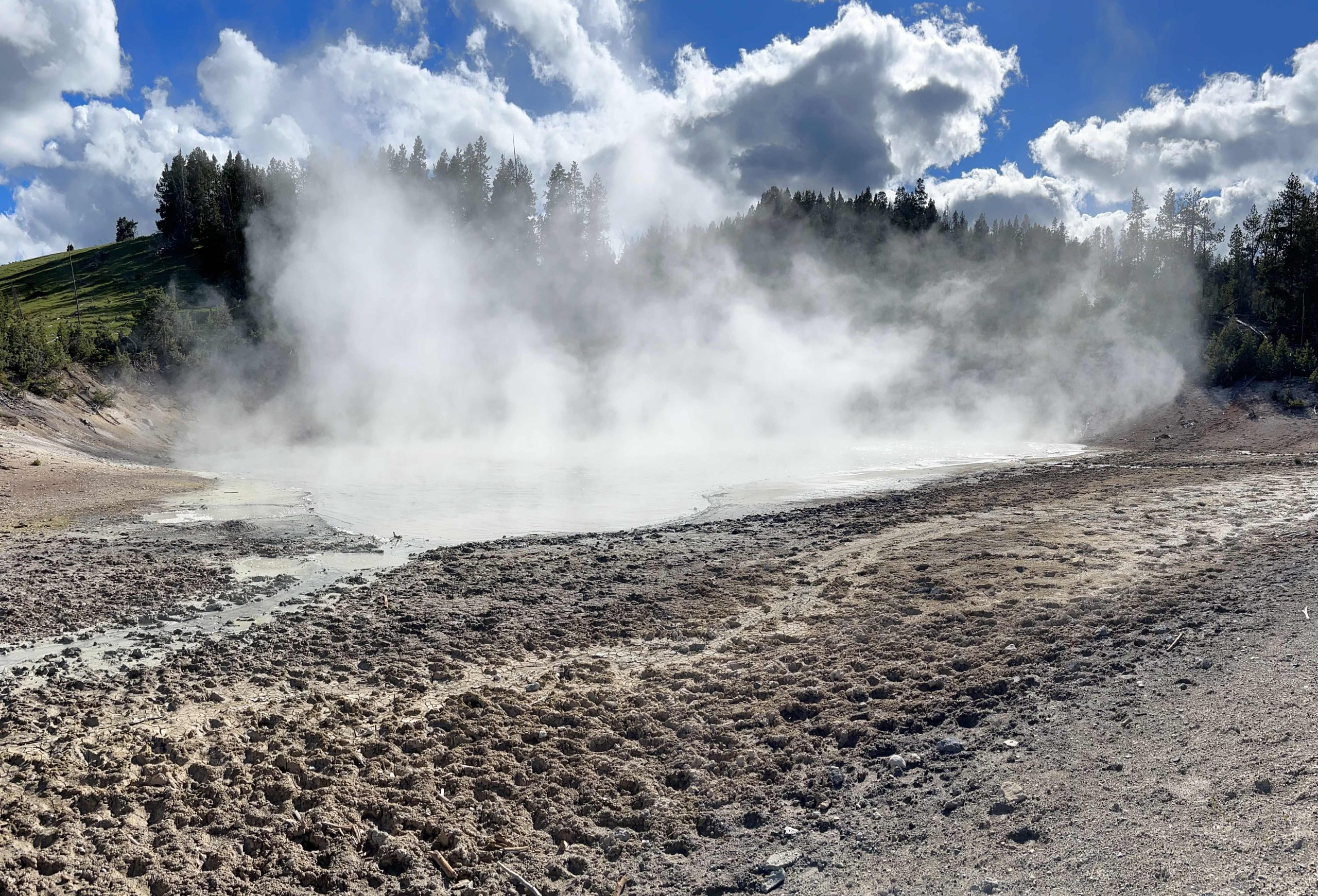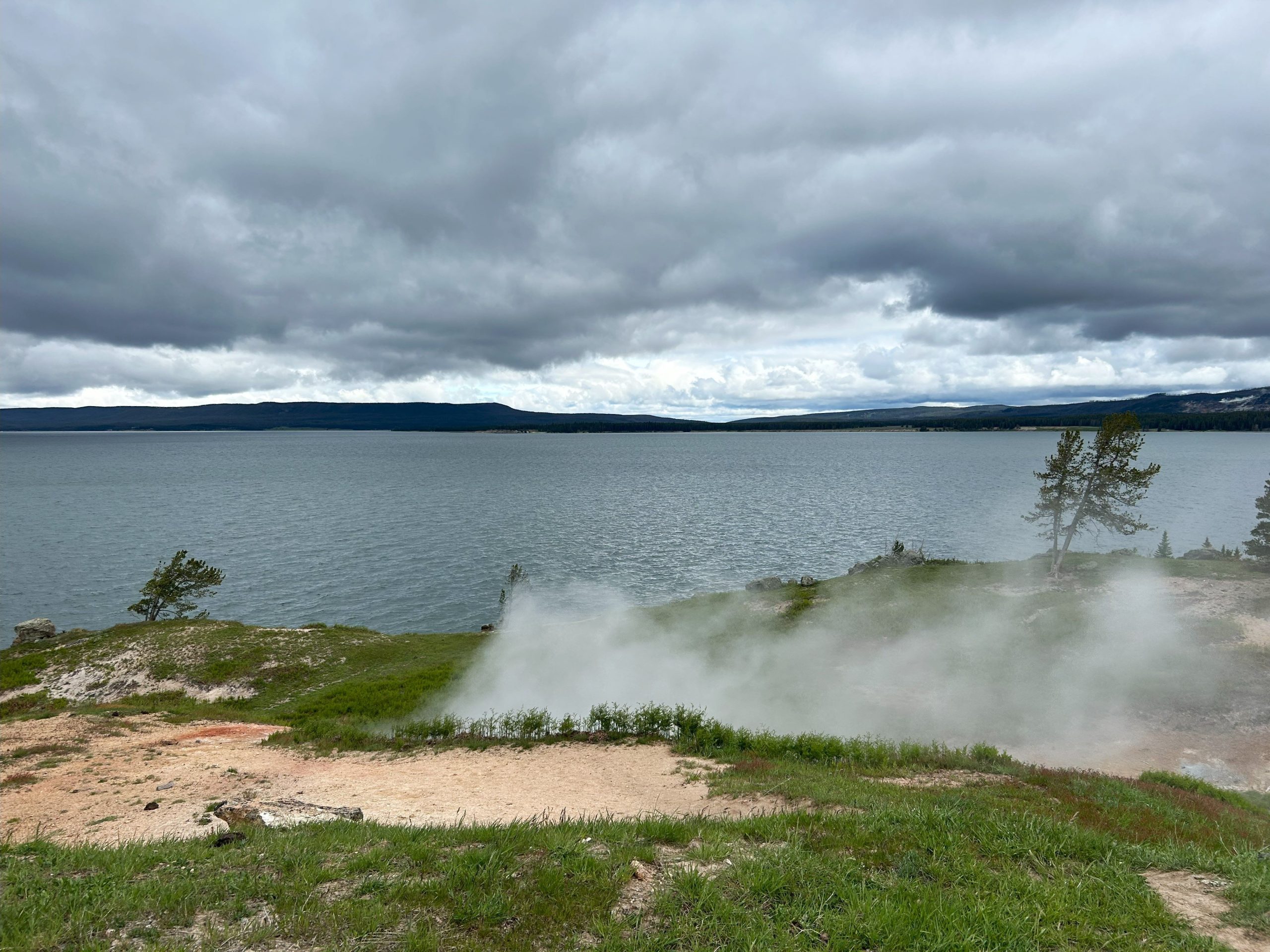 We drove along Yellowstone Lake for several miles. We got out briefly at Steamboat Point, where we saw our first evidence of the caldera responsible for the geysers and other features. But compared to what we saw later, it wasn’t terribly exciting.